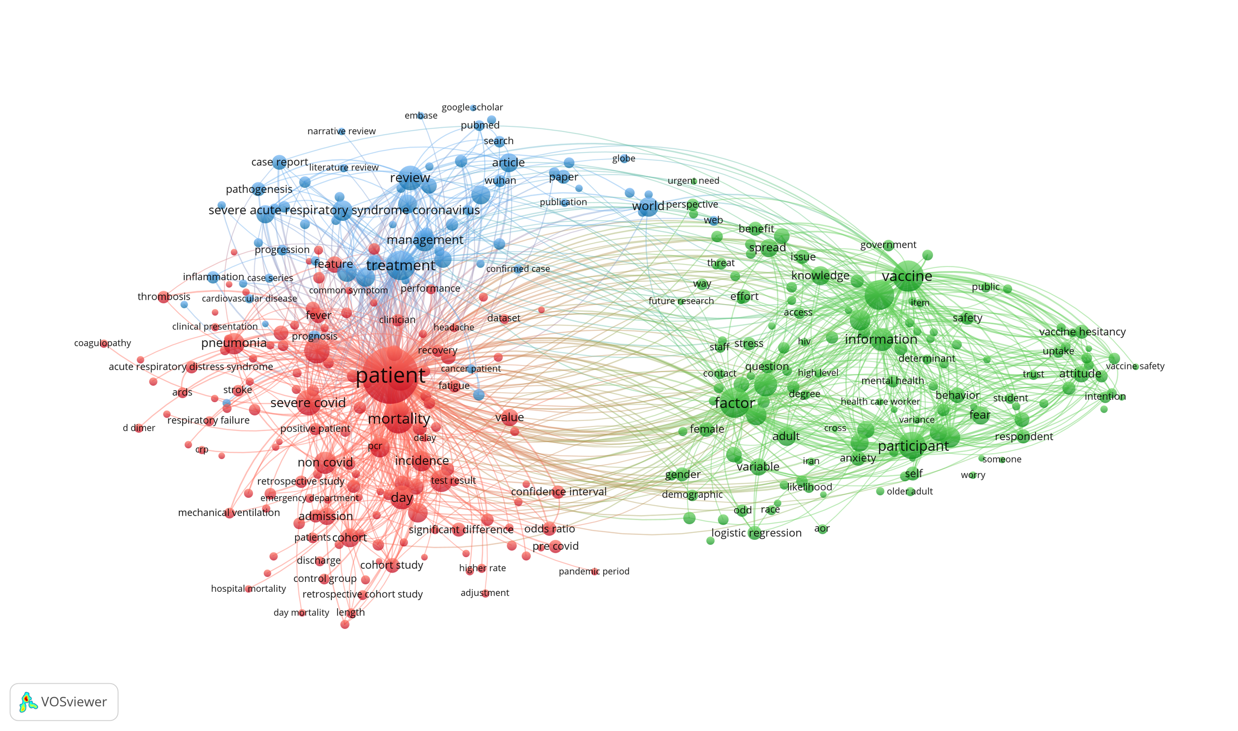 Cluster 1 (red ; 143 terms) contains terms that refer to clinical epidemiology (patient, mortality, severe covid). The terms in cluster 2 (blue, 66 items) refer to disease management (treatment, management) and the terms in cluster 3 (green, 135 items) refer to vaccine research and vacine acceptance (vaccine, participant, attitude). Apparently, there seems to be an evolution from descriptive studies about the clinical features of COVID-19 and the treatment of the disease based on an understanding of its pathophysiology towards studies that focus on vaccin development and research about demographic and attitudinal factors that affect vaccine acceptance.
