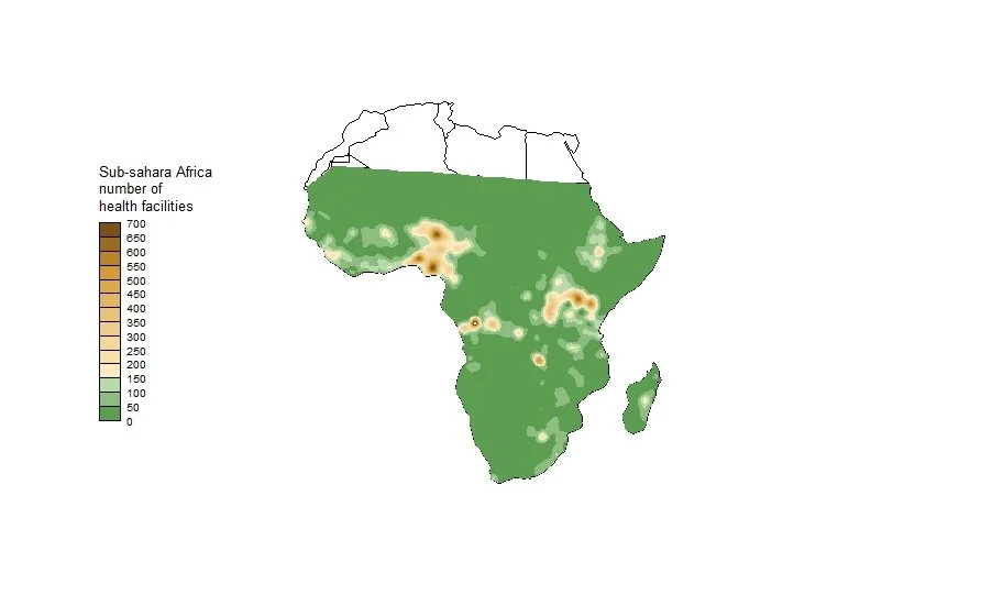We use this geocoded spatial database to visualize the distribution of health facilities with smoothed density maps. The accompanying document describes the workflow in R to produce various smoothed maps.